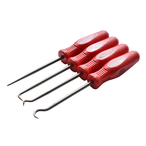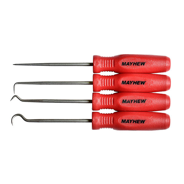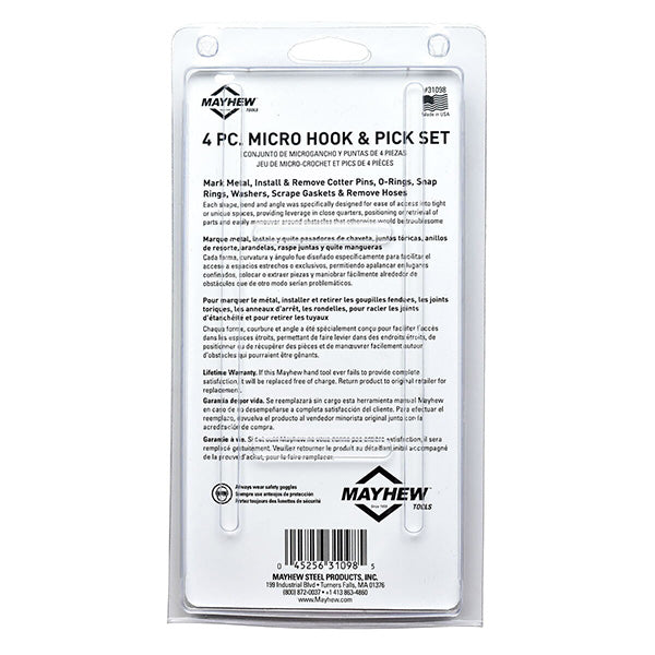 The Mayhew 4 Piece Micro Hook & Pick Set feature four precision, steel picks with comfortable, high-tensile strength Nylon 6 handles. Each shape, bend and angle was specifically designed for ease of access into tight or unique spaces, providing leverage in close quarters. The set includes a straight pick, a 90-degree bent pick, a dual-angle pick, and a micro hook, providing a versatile range of options for various tasks. While designed for the automotive industry, these picks can be used for marking or excavating delicate geological samples. Comes with a lifetime warranty and made in the USA.